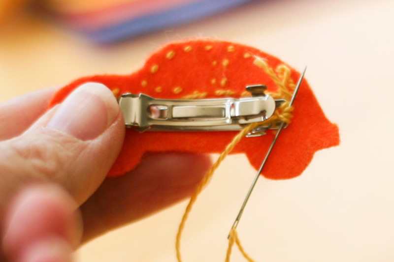 - Cose el coletero al pasador dando las puntadas a través de los agujeritos que trae el pasador (¡ten cuidado de no traspasar la aguja a través de la parte frontal del fieltro!)